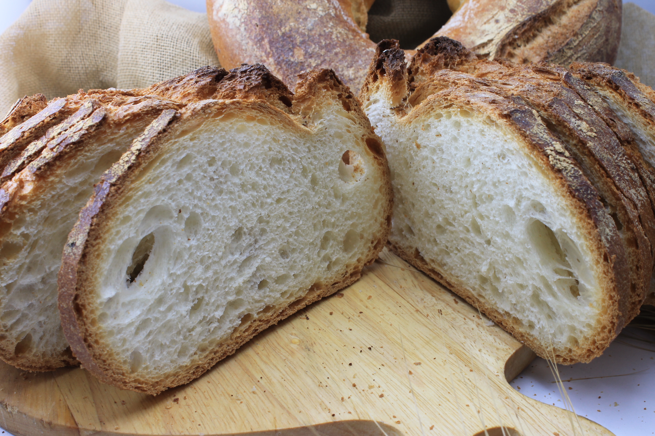 PUGLIESE . Pagnotta da 500 grammi circa, disponibile in tre forme: rotonda, a ciambella e a forma di filone lungo. Ottimo da affettare per delle gustose bruschette.
